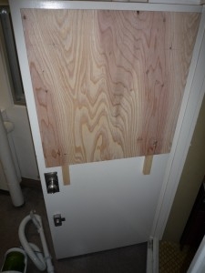年末で急にガラス屋さんの手配など無理でしたので、とにかく手の空いている大工さんに来てもらって、ベニヤで応急処置。