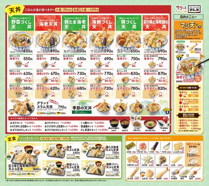 サトフードサービス株式会社(本社・大阪府大阪市、代表取締役社長・杉本 貴之)が運営する「天丼・天ぷら本舗 さん天」では、2024年3月7日(木)より一部店舗(先行8店舗)でグランドメニューをリニューアルします。海老天が2本乗った「海老天丼490円(税込み)」をはじめとしてボリュームたっぷりなメニューを手頃な価格でお楽しみいただけます。