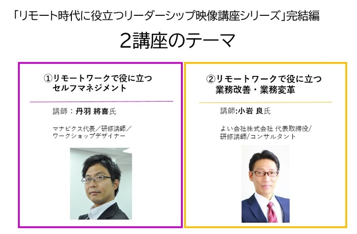 本シリーズの完結編は、①「リモートワークで役に立つセルフマネジメント」②「リモートワークで役に立つ業務改善・業務変革」をテーマに、自律の求められるビジネス環境においてセルフマネジメントを強化し、業務改善・業務変革の具体的な手法を学べる2種類の映像講座です(各5,000円<税抜き>)。各講座は1コマ30分~60分程度で構成され全3時間で完結します。