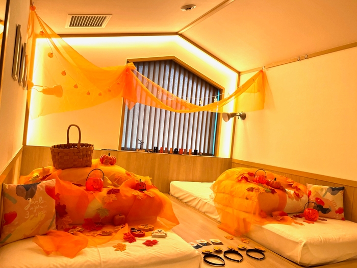 今年のお部屋はたくさんのかぼちゃがお客様をお出迎えする「かぼちゃルーム」。部屋に入ると、かぼちゃをイメージしたオレンジと黒の雰囲気に包まれて一気にハロウィン気分に。壁に貼られたオシャレなポストカードのインテリアで写真映えも間違いなし!部屋の電気を消してイルミネーションライトを点ければさらにハロウィンの夜の雰囲気を楽しめます♡