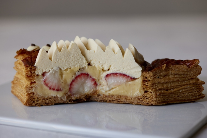 エシレ・メゾン デュ ブールでは、このフランスのユニークな伝統をエシレ流にアレンジ。エシレ バターを使い、しっかりと焼き込んだ魚型のパイに、バタークリームをうろこに見立て美しくデコレーション。うろこのクリームの下には、バター入りカスタードクリームと苺をたっぷり敷き詰め、オリジナルの味わいに仕上げました。サクッとしたパイの食感とふんだんに使ったエシレ バターの芳醇さに、爽やかな苺の甘みが融合したなんとも贅沢な一品。ひと口頬張れば、自然に笑顔が生まれ、幸福感に包まれることでしょう。