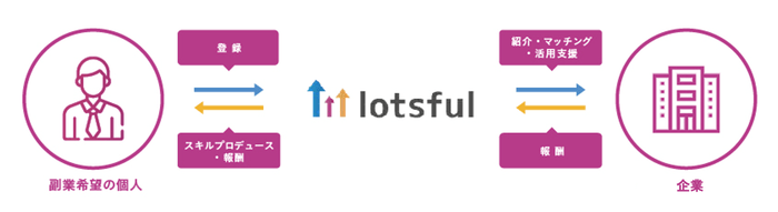 2018年の「副業元年」から始まり、働き方改革やコロナ禍の影響でリモートワークが進む中、大手企業の副業解禁や、副業者の受け入れが徐々に増えつつあります。一方で、成果物やスキルを可視化しづらいビジネス職の外部人材を副業で受け入れることに対しては、大手企業を中心にまだまだ取り組みが進んでいない企業が多いことも事実です。副業人材マッチングサービス「lotsful」では、「企業と個人が共に成長できる副業サイクルの実現」を目指し、ベンチャー企業や企業の新規事業部門における人材不足の課題に対し、事業・組織フェーズに合わせた最適な副業人材をマッチングしています。パーソルの豊富な人材ノウハウを活かして個人のスキルプロデュースを実施することで、戦略立案や新規事業の立ち上げといった難易度の高いプロジェクトで、副業人材活用の成功事例を多数創出しています。