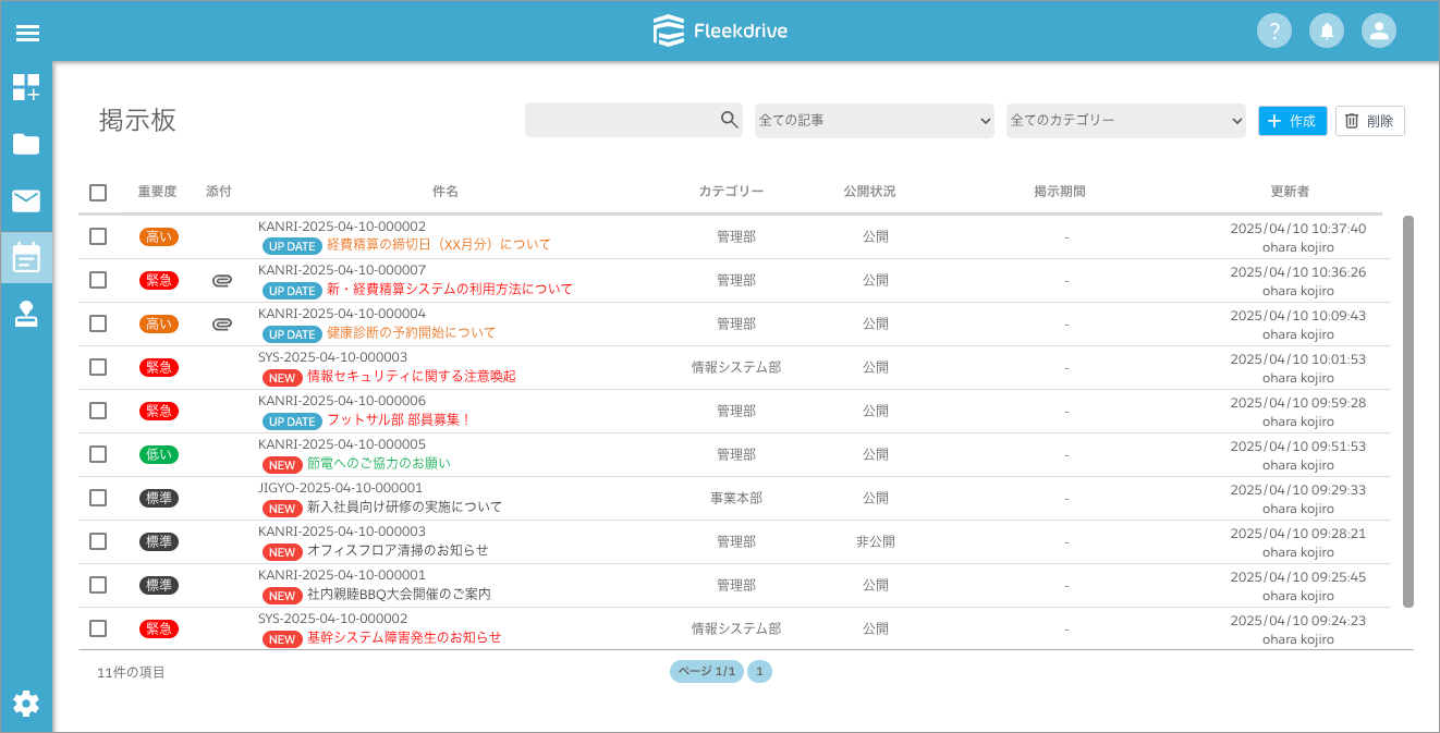 掲示板は、業務に関するお知らせやルールなど組織内で必要な情報を共有するための場所です。個別連絡で起こりがちな情報のばらつきや伝達漏れを防ぎ、Fleekdrive上のメンバーに均一に共有することが可能になります。