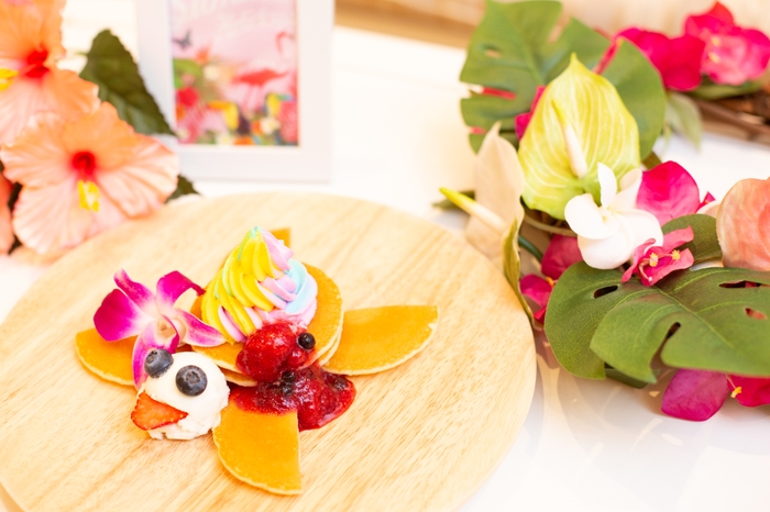 (パンケーキとココナッツムースにフルーツとレインボー生クリームをデコレーションし、ベリーソースをトッピング)