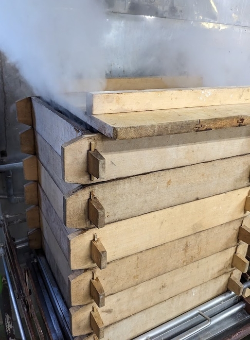 木のセイロに竹敷きを使い、蒸しあげたもち米を、杵にてしっかりと突くので、柔らかく、腰の強い餅になり、煮てもダレることもなく、焼けばしっかりと膨らんでくれます。