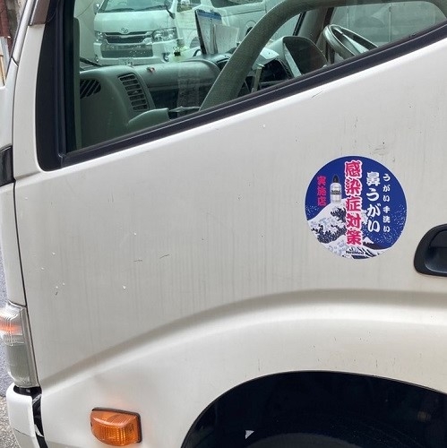 まずは目立つよう店舗に掲示したり、配送用トラックに貼り街中を走り回っています。