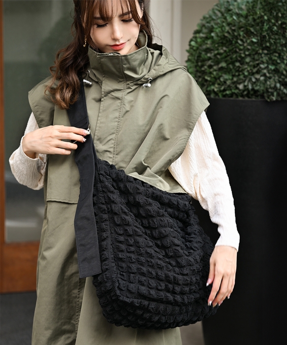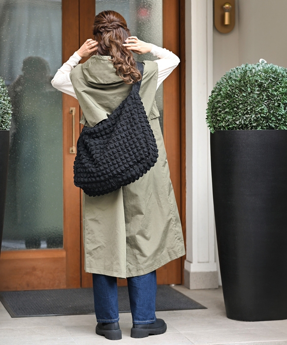 今回のコラボでは、tk.TAKEO KIKUCHIで人気のビッグサイズショルダーバッグをベースに、MUMUさんがこだわり抜いて選んだ生地を使用!ぽこぽことした素材感で今らしいコラボバッグが完成いたしました。