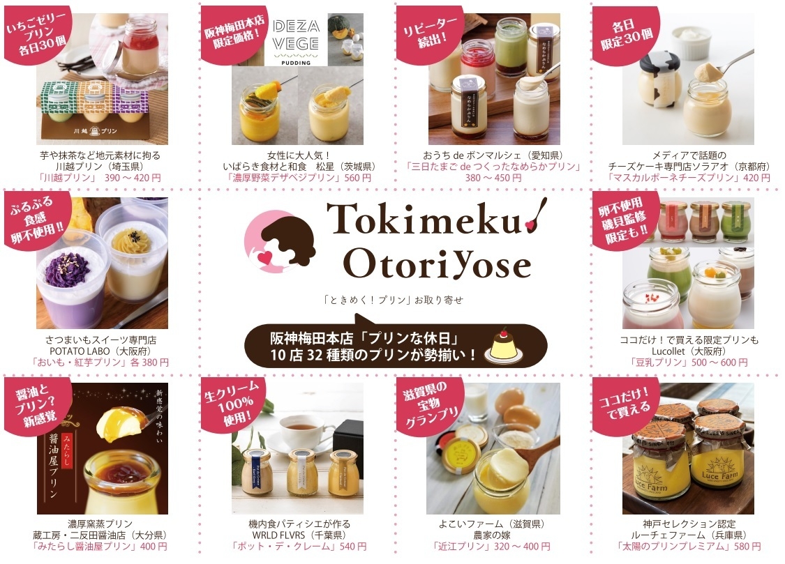 「日本初のプリン専門ECモール『ときめく!プリン』お取り寄せ」は、阪神梅田本店 食祭テラスで開催される「プリンな休日」にて、ECモール出品店舗より、選りすぐり10店舗の32種類のプリンを販売いたします。