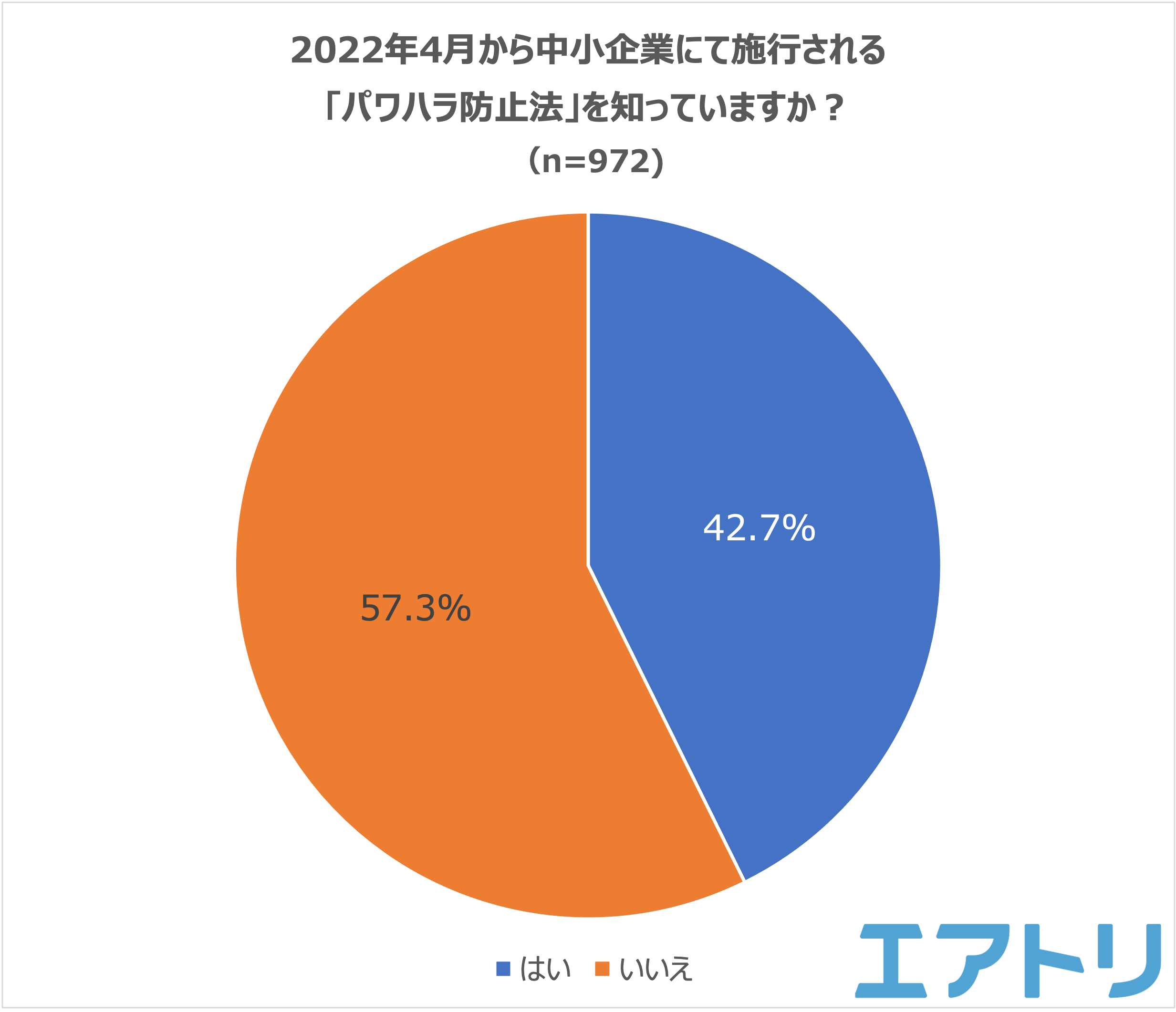 パワハラ防止法を「知っている」人は半数以下の42.7%。