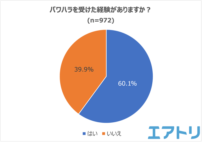 パワハラを受けた経験があるかどうかを聞いたところ、回答者の半数以上である60.1%が「パワハラを受けたことがある」と回答しました。