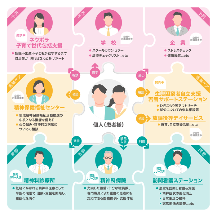 精神保健、精神科医療が重層的支援体制整備に向かっていく中で必要となる、情報基盤構築につながるDXを生み出すため、精神科に特化したクラウド型電子カルテシステムの販売に加え、電子カルテシステムを基盤とした相談記録システムの開発提供や、地域の相談窓口検索ができるポータルサイトの構築などを展開します。