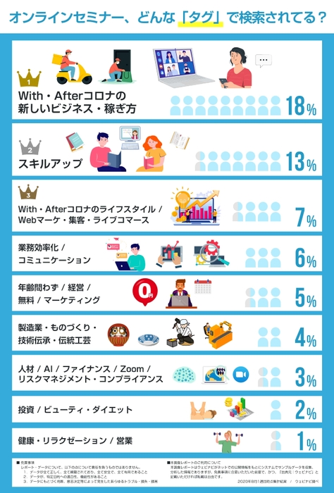 検索上位20位のうち「With/Afterコロナの新しいビジネス・稼ぎ方(18%)」「With/Afterコロナのライフスタイル(7%)」「With/AfterコロナのWebマーケ・集客・ライブコマース(7%)」と、コロナ関連のタグが3割を占めており、幅広い層からの注目を集めていることが伺えました。