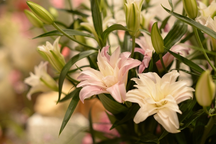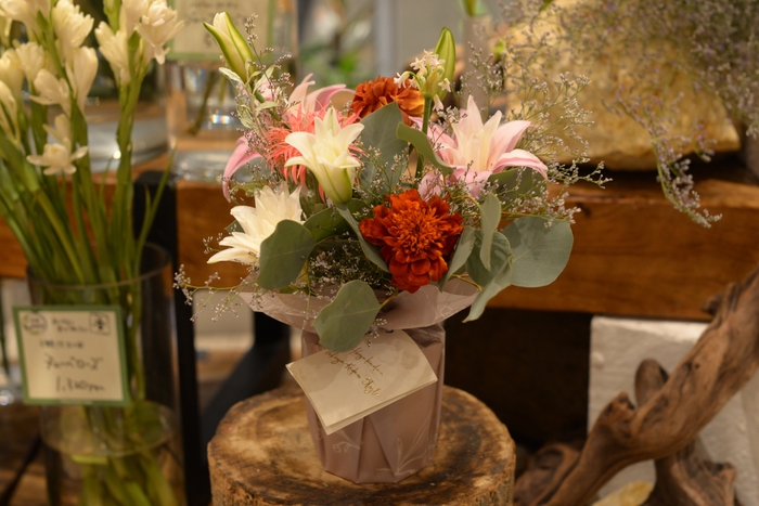 取り扱い花材は、MPS認証(※1)を取得した生産者や適切な品質管理がされた花の認証制度であるリレーフレッシュネス(※2)に参加している生産者から調達するもの、温室栽培ではなく二酸化炭素の排出削減につながる露地栽培で生産されたものかどうかを選択の基準としています。具体的には、MPS認証を取得した栃木県エフ・エフ・ヒライデが生産するユリや千葉県青木園芸が生産するケイトウ、リレーフレッシュネスに参加している北海道るもい花き生産組合が生産するリシアンサスなどを含む、環境に配慮された長く楽しめる旬の花々が並びます。