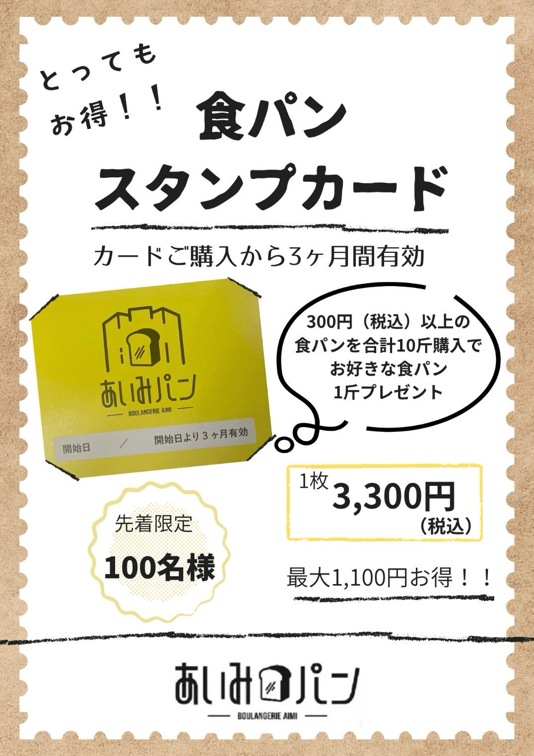 あいみパン 古淵店・成瀬店にて、食パンの前売り券となる スタンプカードを先着100名様限定で販売開始!