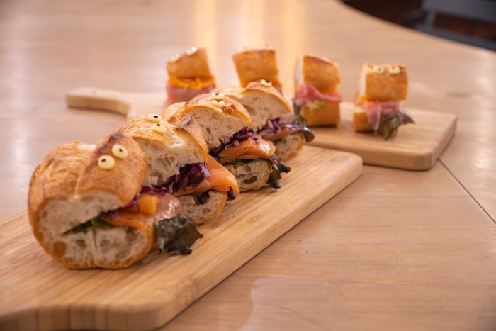 ・フランスパンを半分に切り、その間にサーモンと生ハムを舌にように挟み、二つの穴をあけて目の形にしたチーズが乗ったバケットサンド。
