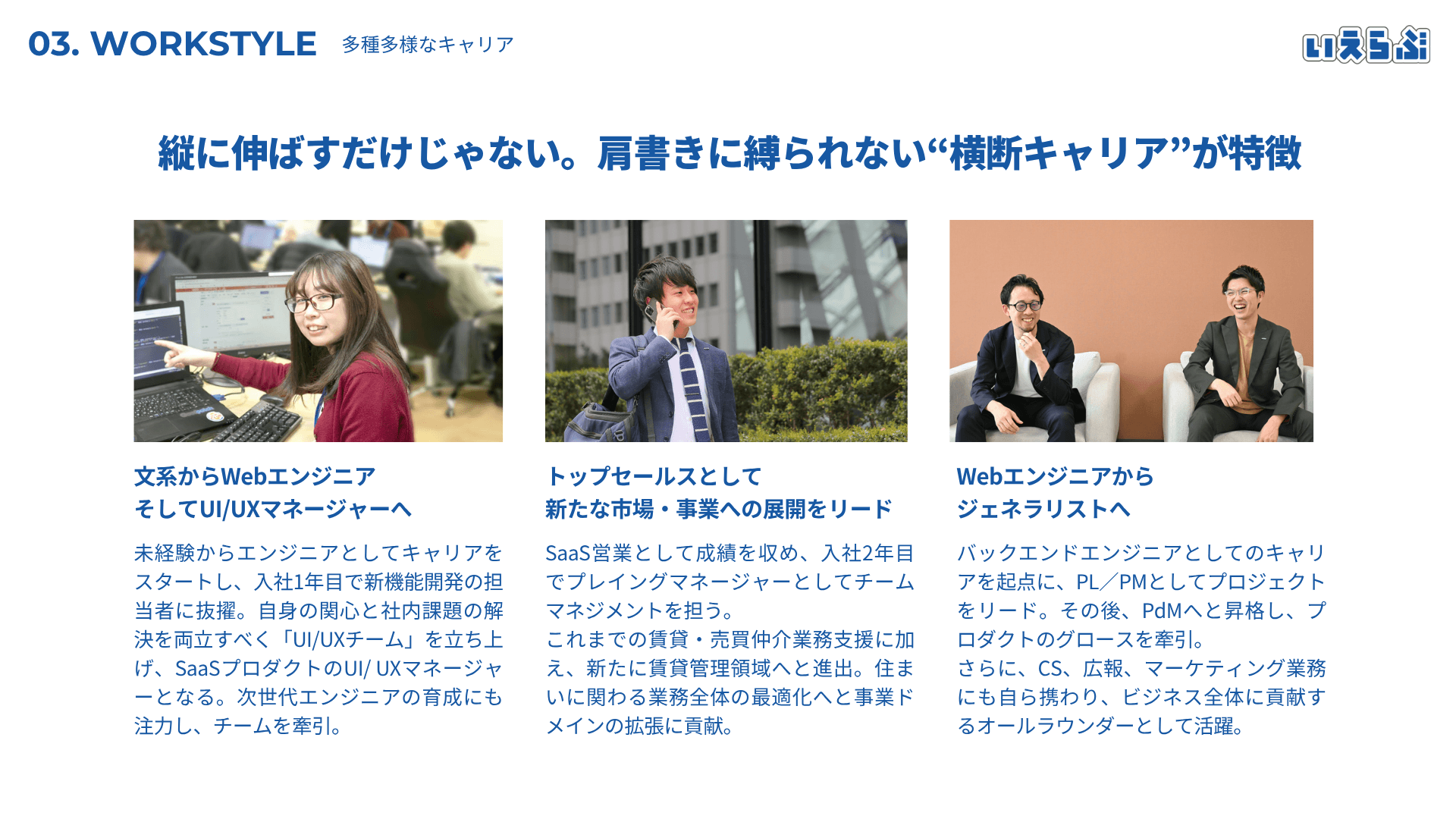 本カルチャーデックは、事業内容や会社概要に加え、いえらぶGROUPで働く「人」や独自の「カルチャー」に焦点を当てた内容となっており、求職者の方が当社で働くイメージをより具体的につかんでいただくことを目的としています。