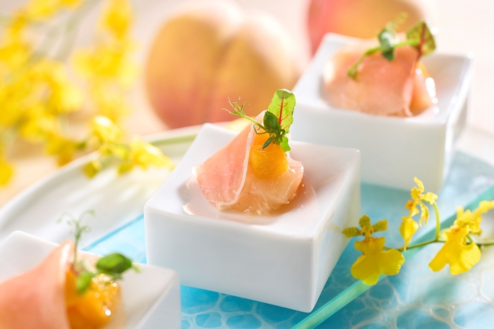 生ハムの塩味と桃の上品な甘みが絶妙にマッチした一品。ワインとのマリアージュはもちろん、新たにご提供する地酒との相性も良いです。