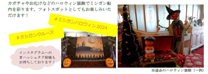 フェア期間中は船内がハロウィン装飾で彩られ、ハロウィンにちなんだドリンクメニューやアフタヌーンティーセットをお楽しみいただけます。また船内3Fには「ミシガンオリジナル缶バッジガ