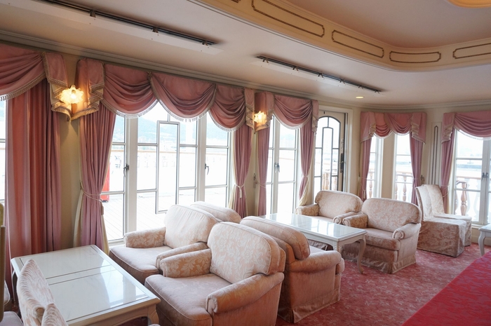 最上階デッキからは、びわ湖南部の美しい景色や比叡山・坂本の街並みをご覧いただけます。また、レストランシップとして軽食から本格的なお料理まで楽 しめるだけでなく、音楽ライブや観光案内も楽しむことができるエンターテイメントクルーズ船です。