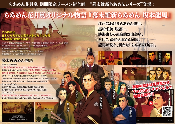 4月の期間限定ラーメンは、“幕末維新らあめんシリーズ”です。このシリーズは、幕末の英雄をテーマに、その偉人のイメージや、ゆかりのある地の食材を用いて“花月嵐ラーメンマエストロ(商品開発)”がオリジナルラーメンを開発する新企画です。その記念すべき第一弾として、幕末の風雲児・坂本龍馬をイメージした『幕末維新らあめん 坂本龍馬』が登場します。今回登場する一杯は、【日本のらあめんに夜明けをもたらすべく、坂本龍馬が“薩長らあめん同盟”を結び、新たなラーメンを開発する】という、“花月嵐のオリジナルストーリー”を創作した、ラーメンとエンターテインメントを融合させた一杯です。