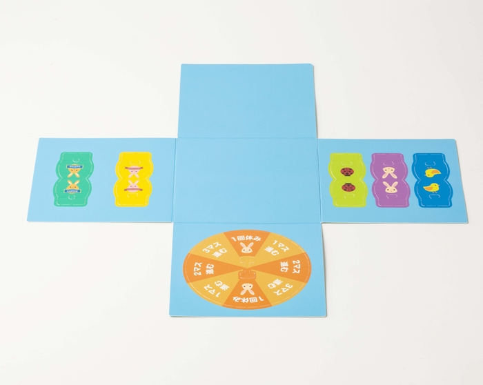 この包装容器は外箱がボードゲーム用の盤面、二重の内箱がボードゲーム用の駒、蓋の部分はルーレットの土台になります。パッケージを構成している全ての部材を利用して遊ぶことができ、お菓子や雑貨類を購入した子どもや家族が一緒になって遊ぶことができます。