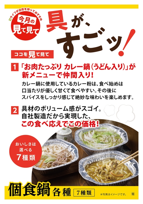 昨年大変ご好評いただいた「個食鍋」を、さらに魅力ある商品にリニューアルし再販売いたしました。今年度は、新商品として幅広い世代から人気の「カレー」のおいしさを活かした「お肉たっぷりカレー鍋(うどん入り)」を新発売いたします。また、お客様がお求めやすいお買い得価格を実現するため、野菜やお肉の加工・盛り付け・スープの製造はすべてライフの自社センターで行っています。7種類の商品をご用意しておりますので、ぜひ食べ比べてみてください!