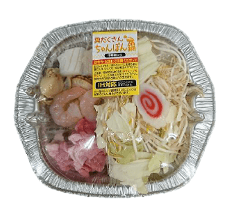 九州産豚肉こまぎれ・エビ・赤イカ・ベビーホタテ・キャベツ・もやしが入った具だくさんのちゃんぽん鍋。