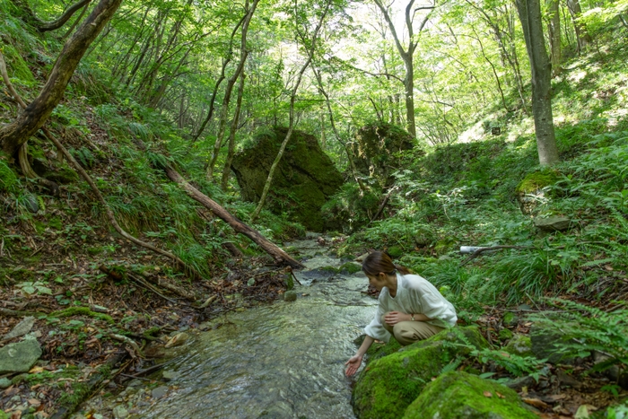 湯の神様として奉られている「湯神神社」の奥を進み、「夫婦(めおと)岩」とも呼ばれる二ツ岩に通じる全長約200メートルの散策路をスタッフと一緒に散策。なだらかな山道を、清流沿いに川音を聴きながら15分ほど歩きます。