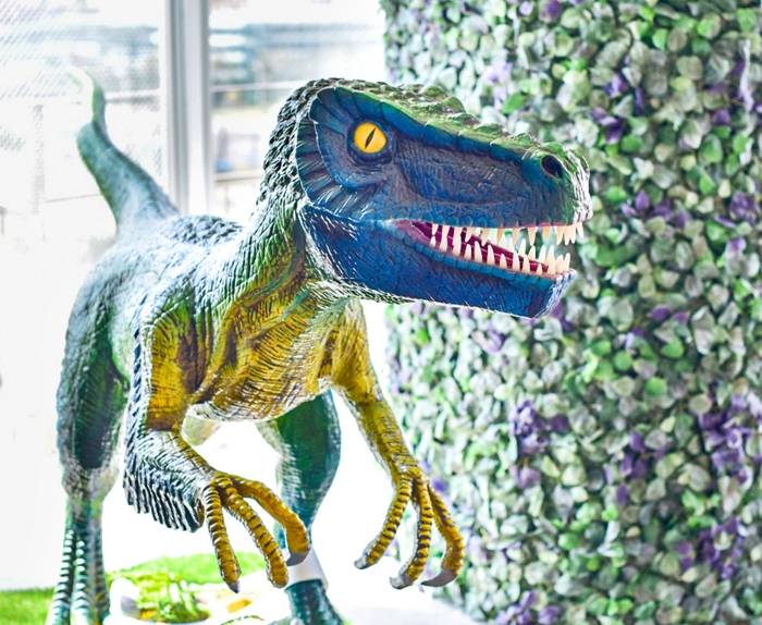 大きなベロキラプトルに白亜紀のジャングルをイメージしたフェイクグリーンで装飾した室内は非日常気分を味わえます。