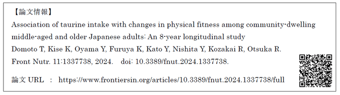 大正製薬株式会社[本社:東京都豊島区 社長:上原 茂](以下、当社)は、国立研究開発法人国立長寿医療研究センター(以下、長寿医療研究センター)と北翔大学との共同研究で、食事からのタウリン摂取量が多いと8年後の脚の筋力(膝伸展筋力)が維持される傾向にあることを見出し、食品科学と栄養学に関する国際的な科学オンラインジャーナルである「Frontiers in Nutrition」にて論文を発表しました。