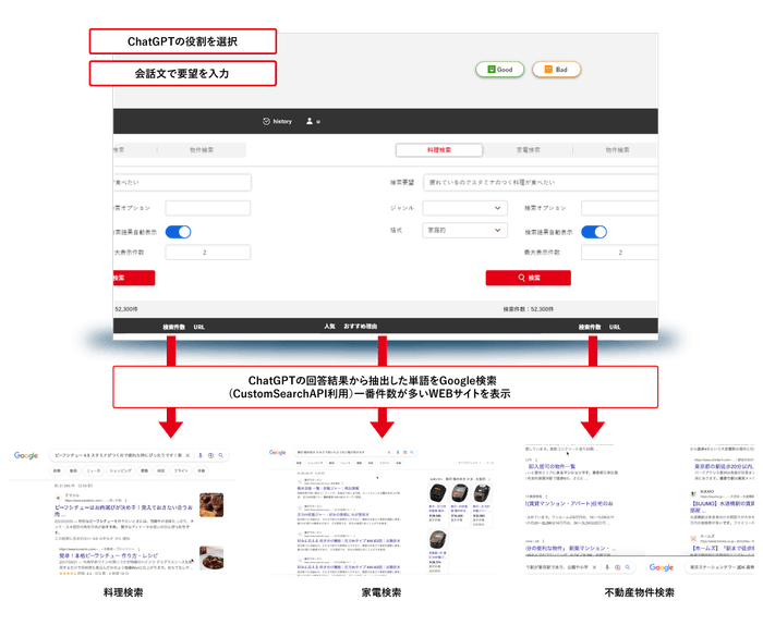 従来は、ChatGPTと対話する中で、本当に欲しい情報にたどり着くために、追加の情報を入力しなおす必要がありました。しかし、クリエーションラインが開発したレコメンドシステム「RecoMagic」を活用することで、ユーザーはよく使われる言葉の中から追加の条件を選ぶなど、簡単な操作で情報を検索することが可能になります。