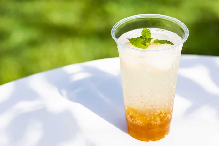 イベント限定のドリンク「甘酒氷のシトラスソーダ」(680円*税込み)を販売します。コップの底にピール入りのシトラスジャムを入れ、その上に微炭酸のソーダを注ぎ入れました。甘酒を使用した丸い氷を浮かべ、氷が解けていくと、ほのかに甘みが加わります。飲む点滴と言われる甘酒は、運動で失われる身体の水分や糖分、ミネラルの補給にぴったりです。黄色から白のグラデーション、しゅわしゅわと泡立つ爽やかなドリンクは、見ているだけで気分が明るくなるようです。トンボの湯に隣接する「カフェ ハングリースポット」で購入できます。