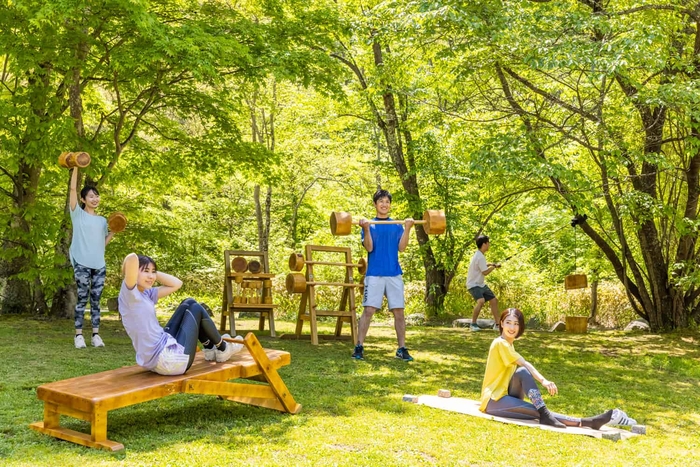 日帰り立ち寄り湯「星野温泉 トンボの湯」横の広場に、期間限定で野外のフィットネスジムが登場します。屋外に木製のエクササイズ器具を置き、気軽に利用できる開放的なジムです。ジムは、「Active」と「Conditioning」の2種類のフィットネスエリアに分かれています。「Active」には、ダンベルやバーベル、腹筋台など主に筋力を鍛えられる器具を用意します。今年新設するのが「Conditioning」です。広場の樹木を活かしたオリジナルのストレッチ器具やヨガマットを設えます。ストレッチ器具は3種あり、背中や上半身、脚を気持ちよく伸ばすことができます。