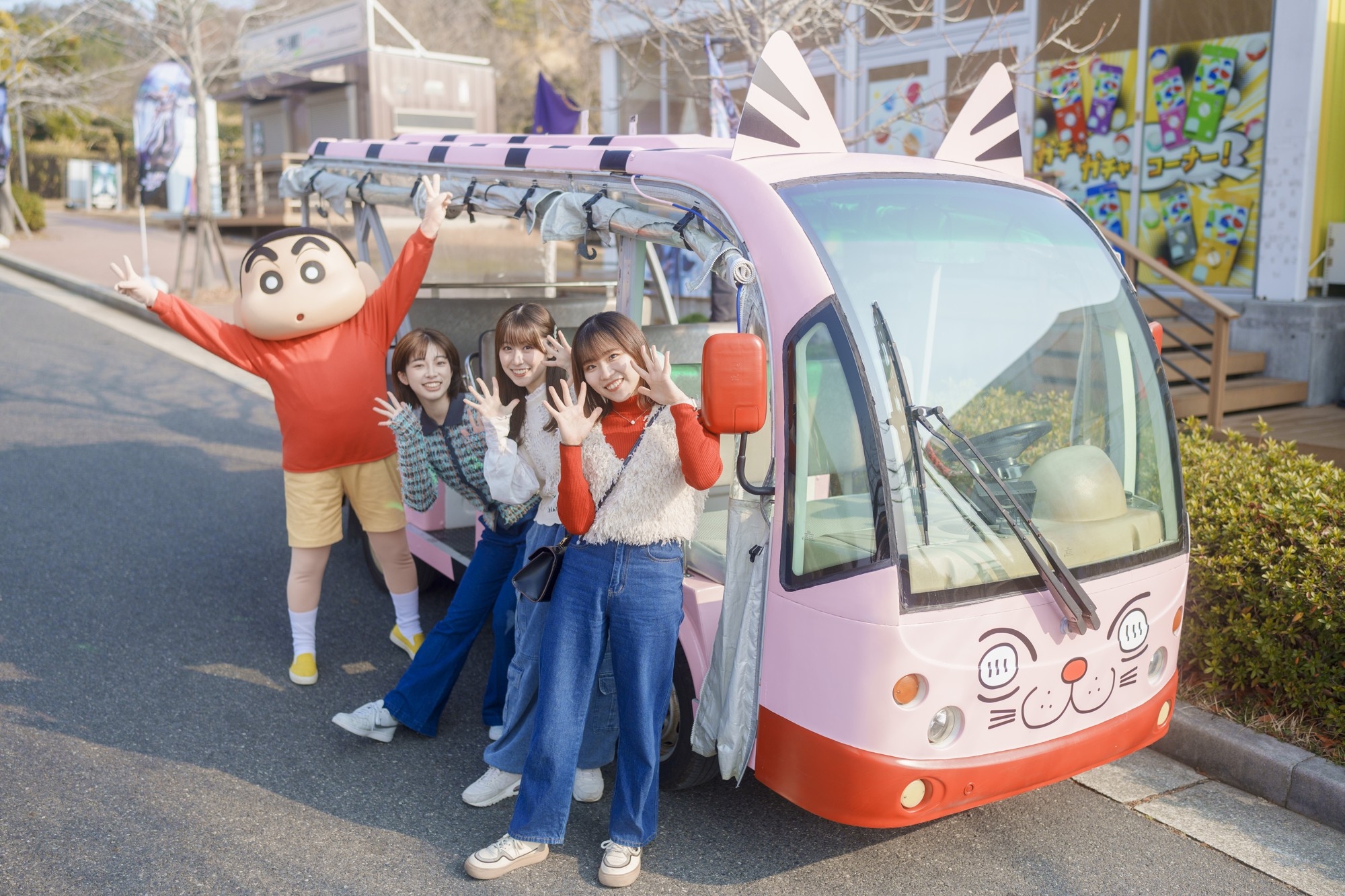 しんちゃんたちが通う「ふたば幼稚園」のバスが、土日祝限定で運行中。実際にバスに乗って移動しながら、アニメの世界に入り込む特別な体験が楽しめます!