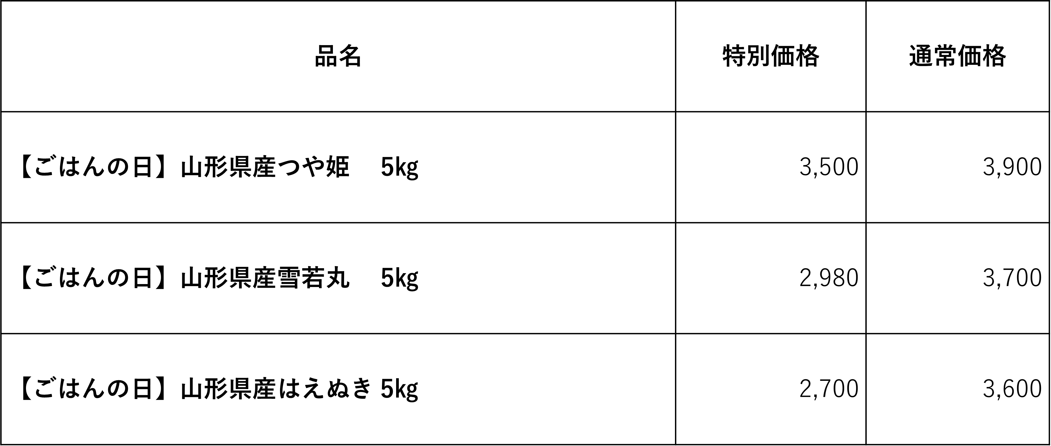 このイベントは、「小さなYAMAGATAマルシェ」が独自で制定した“にこにこ「ごはんの日」”に限り、対象の山形県産のお米を最大25%の割引価格で販売するイベントです。お米を通常よりもお得に・気軽にネットショップで購入していただき、消費拡大をはかるのが狙いです。山形県の主要3品種のお米「つや姫」「雪若丸」「はえぬき」が対象となり、「つや姫」は外観・食味・香り全てが高水準のお米、「雪若丸」は粘りと硬さが新食感のお米、「はえぬき」は食べ飽きないバランスがとれたお米です。