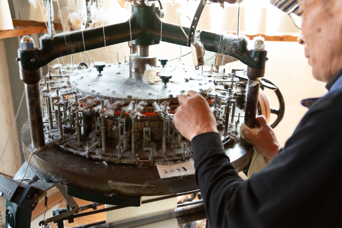 『プラスニド』の製品は、日本に数台しかない昔ながらの編み機で、数十年の経験を持つ熟練の職人により、ゆっくりと作られています。繊細なオーガニックコットン糸の特性に合わせ、長年の勘と感覚を頼りに細かく微調整しながら、ひとつひとつ丁寧に編み込まれています。最新の全自動編み機では得られない、アナログならではのぬくもりと風合いを感じることができます。