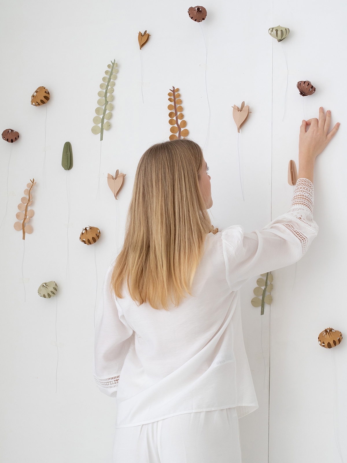完成した紙のお花は、お気に入りの花瓶に飾ったり、壁に貼ったり、本物のグリーンと合わせたり、リースアレンジとしてなど自由にお楽しみいただけます。