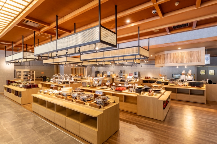 “美味しさと楽しさの融合”を目指したプレミアムな創作バイキングでは、サーロインステーキや温泉せいろ蒸しをはじめ色とりどりのデザートやソフトドリンクも飲み放題(無料)で種類豊富に揃えており、一年を通してさまざまな美味しさでおもてなしいたします。夕食時のライブキッチンではシェフ自慢の調理ショーを目の前で見ることができ、美味しさも楽しさも倍増。五感を刺激する食体験を心ゆくまでご堪能いただけます。