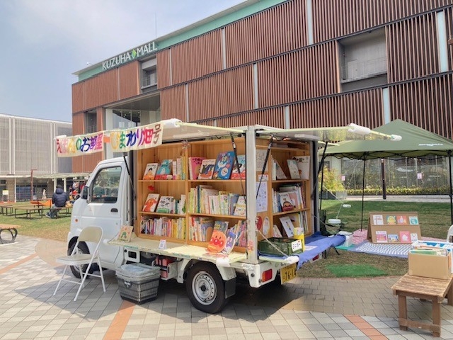 香里ケ丘の民家を開放した絵本のお部屋が移動販売車で芝生広場に