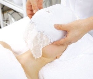 石膏パックの時には首周りを一緒に温めるとさらに効果的です。ホットタオルなどを首の下に入れることで、温熱効果がさらに高まります。