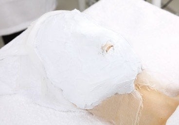 顔の上にフェイシャルガーゼをかぶせ、水、エッセンスなどと混ぜた柔らかい石膏を塗ります。※髪の毛が入らないようにご注意下さい。