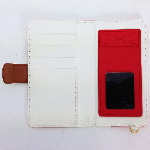 内側もご紹介していきます。開くとシックなブラウンカラーで、オシャレですね。スマホを粘着固定するタイプなので、簡単に装着できます。粘着部をスライドさせればカメラも使えるので、写真撮影OKなんですよ。左側にはカード収納もついていて、至れり尽くせり!チャームリングも下部についているので、ストラップなども取り付け可能なんです。