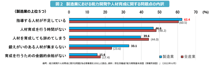 現在、製造業全体では人材の力を引き出し若手を活用することが大きな課題となっています。特に、当社が多くの企業から耳にしているのが、「若手が早期に離職してしまう」「人を育てられる環境づくりができていない」「ほしいと思える人材が集まらない」といった問題です。実際に、厚生労働省の「2023年版 ものづくり白書」でも、製造業の企業が持つ人材課題として「指導する人材が不足している」「人材を育成しても辞めてしまう」「鍛えがいのある人材が集まらない」がランキング上位に挙げられています。
