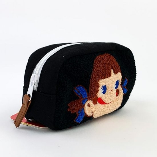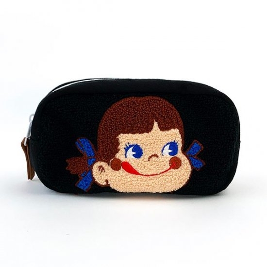 もこもこな手触りがクセになる、サガラ刺繍のポーチです。ブラックの本体に、おなじみ過ぎるペコちゃんのフェイスデザイン♡