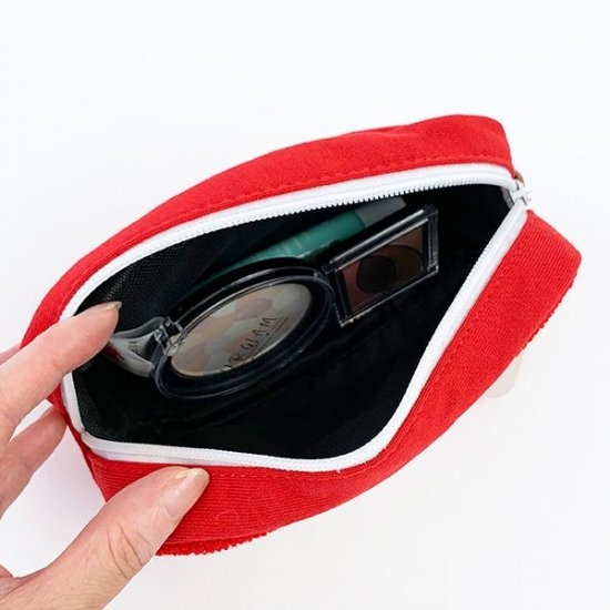 以前にも、サガラ刺繍のポーチをご紹介しましたが、少し横長になったバージョンです。マチも上部まであって広いので、自立してくれるのも便利♪