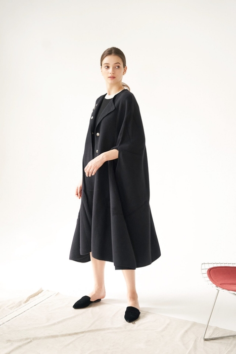 たっぷりとしたドレープ感でどのような体形の方にも素敵にお召しいただけるロングマントや、フード部分の襟幅が大きくエレガントにもカジュアルにもお召頂ける両面使いのコート、立ち襟からのVネックが美しい定番セーターなどを始め、テクニック不要で装いに格が備わるマフラーやファー使いが華やかなニット帽などの小物類も勢揃いします。