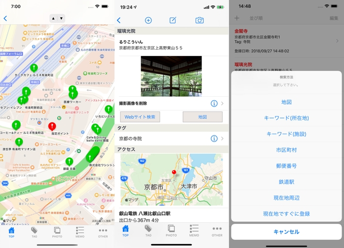 地図やキーワード、市区町村、郵便番号、鉄道駅、現在地から周辺の施設等を検索してタグを付けてブックマークし、メモや写真を登録できます。