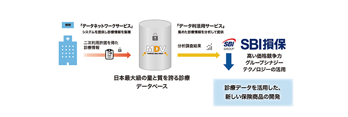 日本のインターネット金融のパイオニアであるSBIグループの保険事業の中核を担うSBI損害保険株式会社(本社:東京都港区、代表取締役社長:五十嵐正明、以下「SBI損保」)と、国内最大規模の量と質を誇る診療データベースを保有するメディカル・データ・ビジョン株式会社(本社:東京都千代田区、代表取締役社長:岩崎博之、以下「MDV」)とは、診療データを活用した保険商品の開発に関する基本合意書を締結しましたのでお知らせいたします。