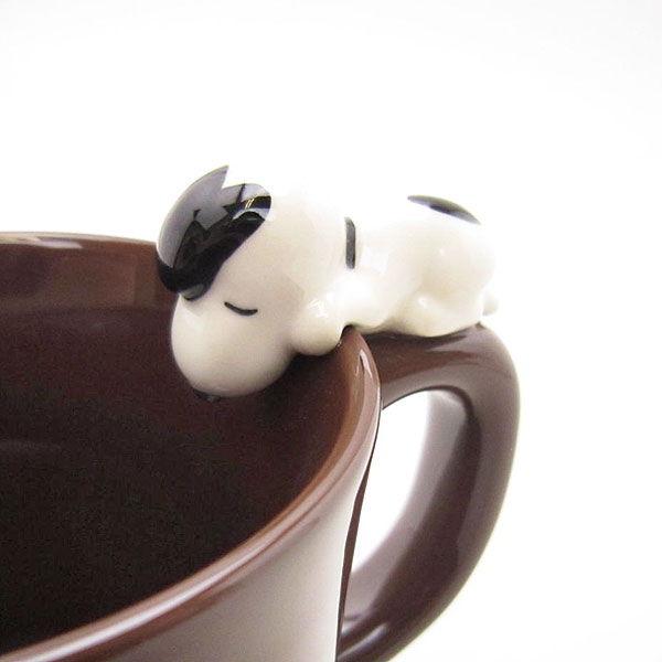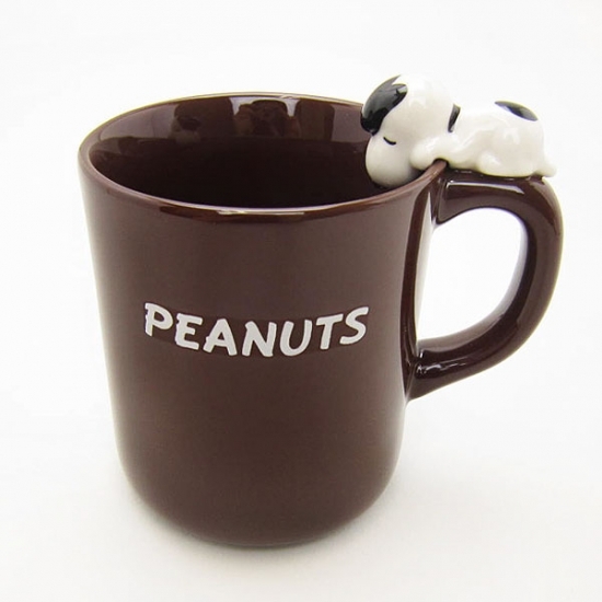 続いては、スヌーピーのフィギュア付きマグです。深いブラウンカラーのマグの上に、かわいいスヌーピーがくっついています。マグの中を覗いているようですね♪カップ部分のデザインは、PEANUTSのロゴのみのシンプルさ。