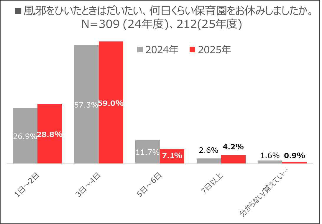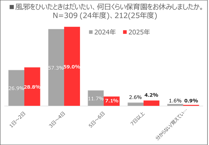 このような保育園に通い始めたお子様が、風邪などの感染症にかかる現象は「保育園の洗礼」と言われている。この「保育園の洗礼」という言葉の認知率も高まっており、今回の調査では保育園に通わせる親の約8割が「保育園の洗礼」というワードを、さらに45%の方が内容まで把握しているという結果となった。また昨年に引き続き、お子様が風邪をひくと3~4日休ませた方が最も多いということがわかった。